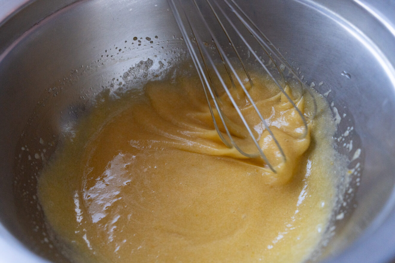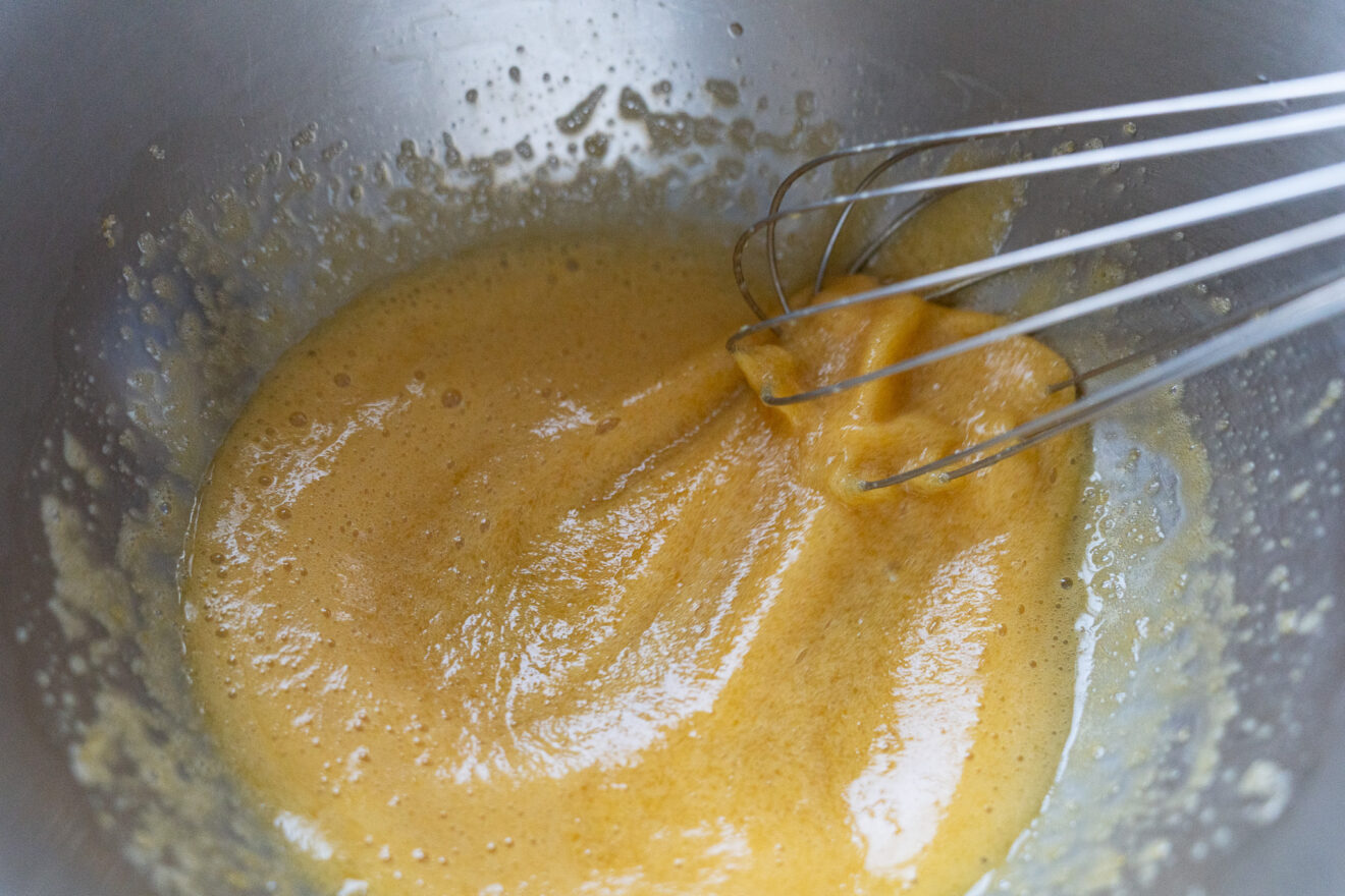 1)ボウルに卵を溶きほぐし、砂糖を加えてすり混ぜます。