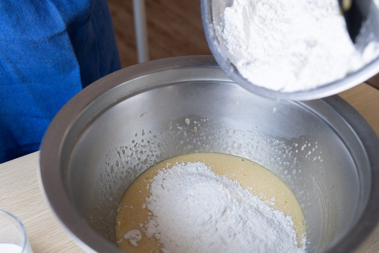 2)均一になったら、合わせておいた薄力粉、ベーキングパウダーを2、3回に分けて加え、ゴムベラでさっくりと混ぜます。