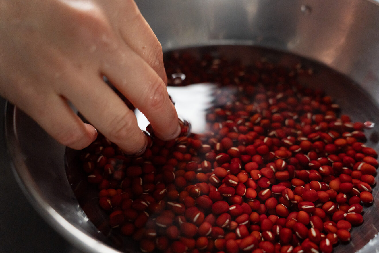1)ボウルに小豆を入れ、水でやさしく洗います。