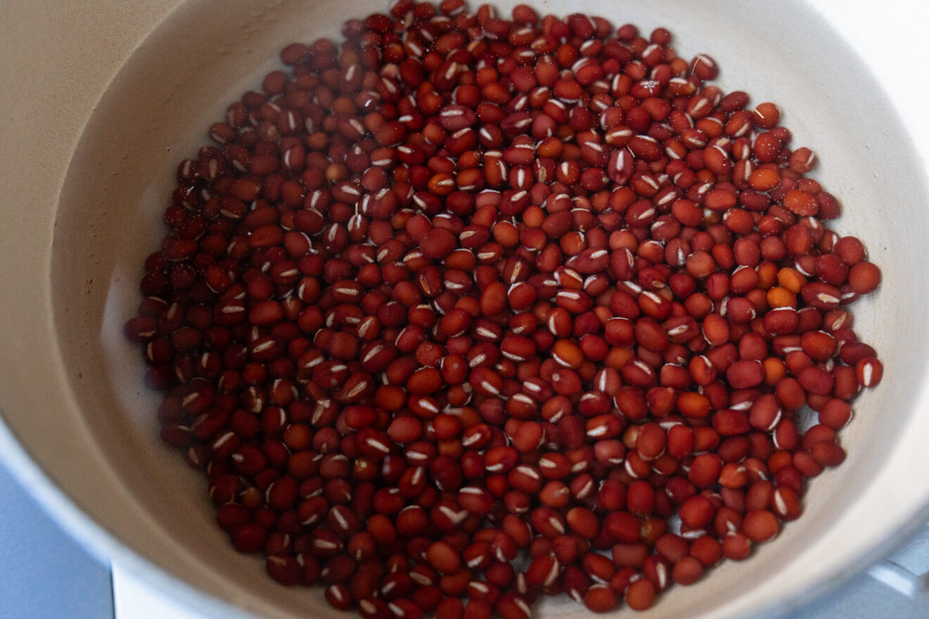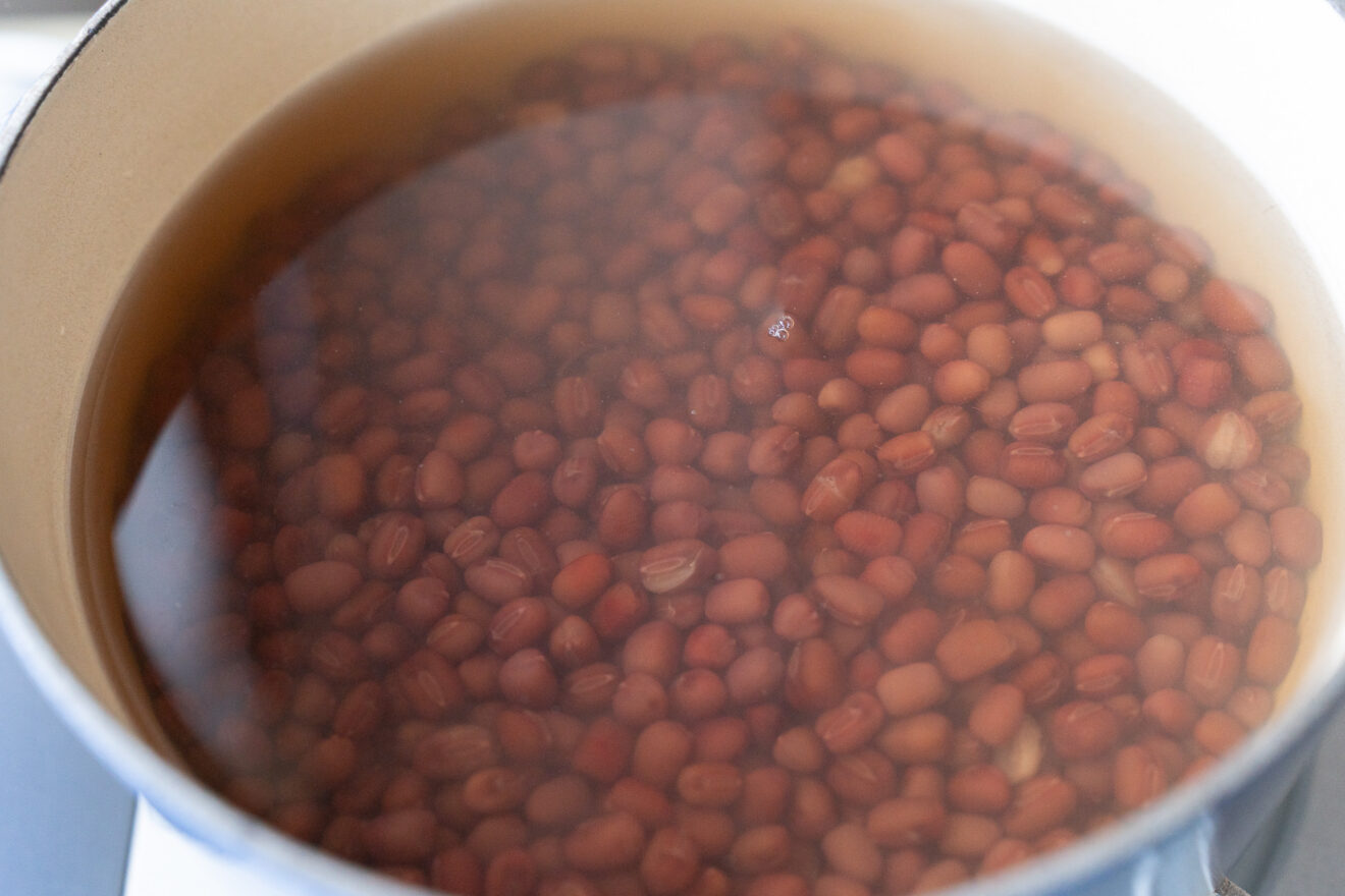 3)小豆を鍋に戻し、ふたたびたっぷりの水を入れて、蓋をして強火にかけます。沸騰したら弱火にして、約30分炊きます。