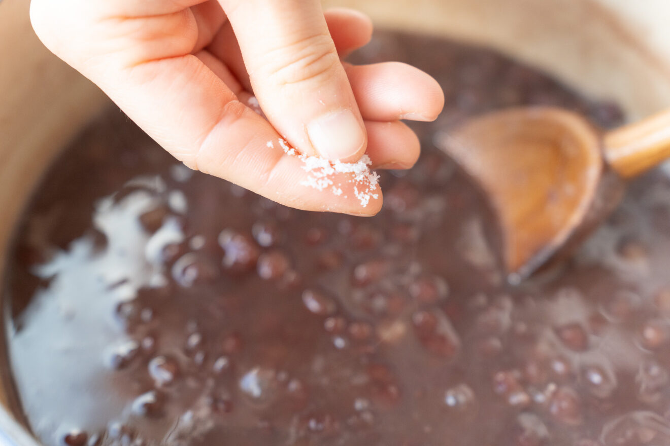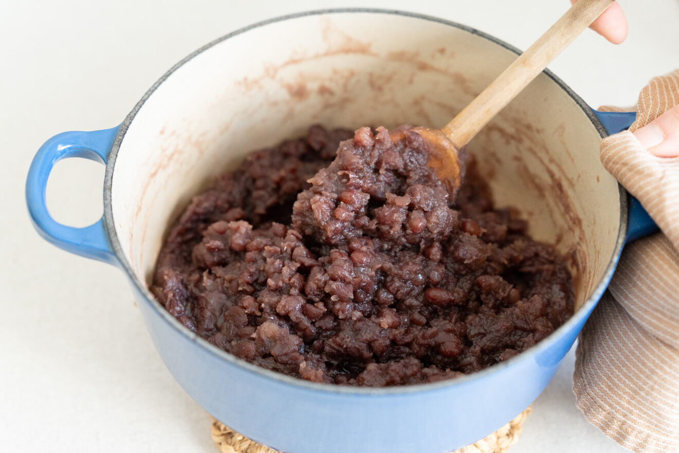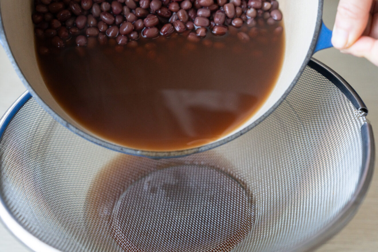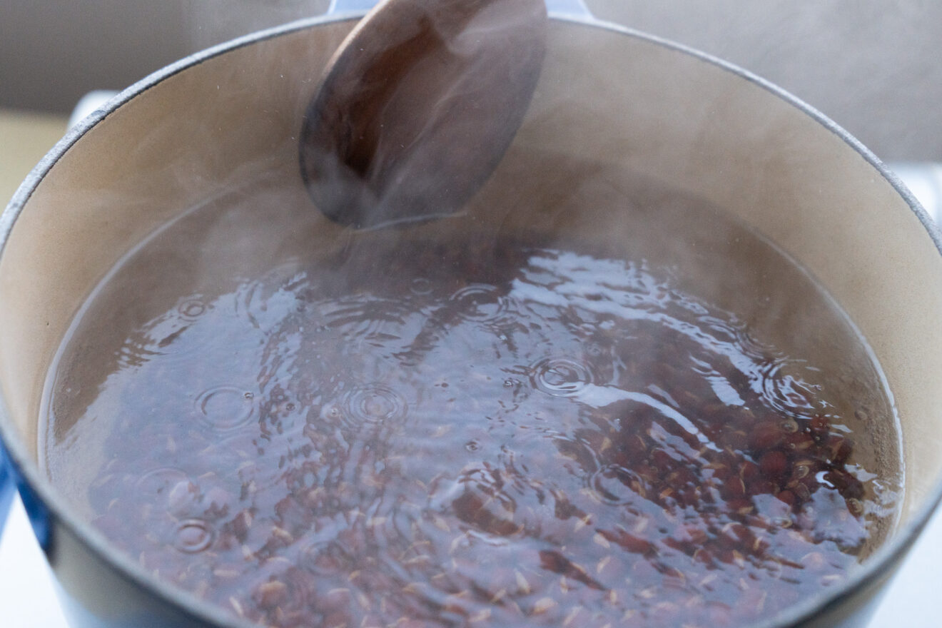芯まで小豆がやわらかくなったら、火をとめてそのまま30分蒸らします。