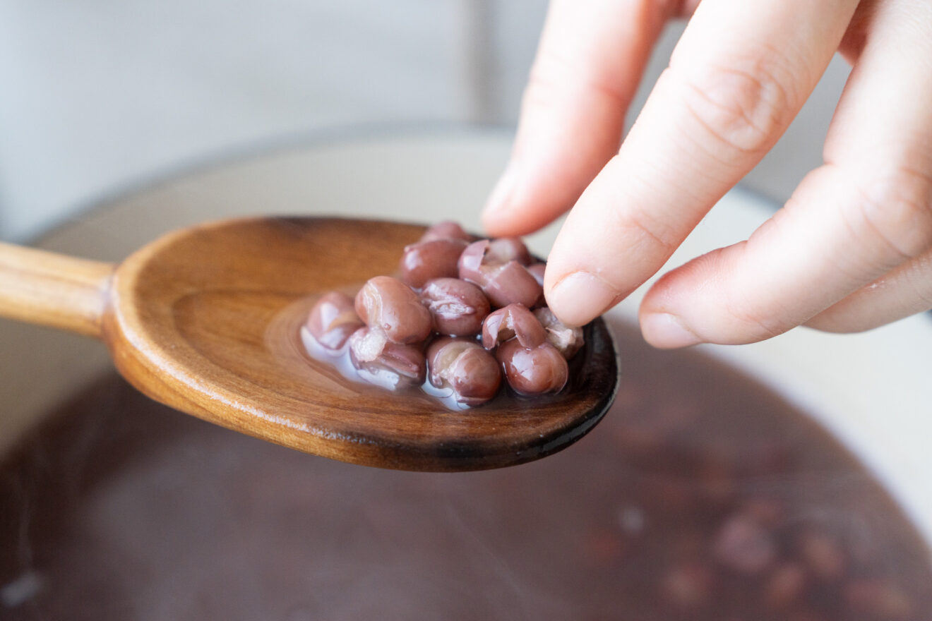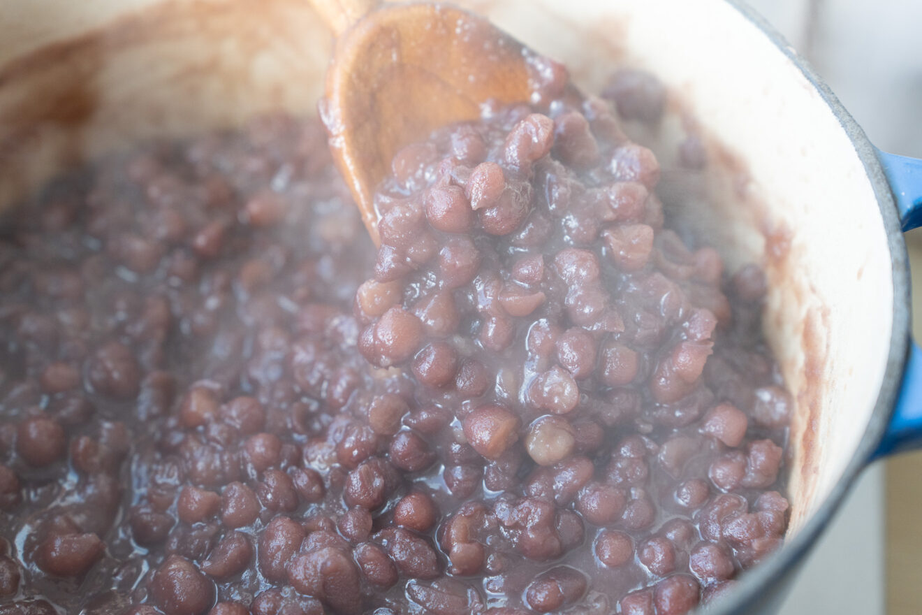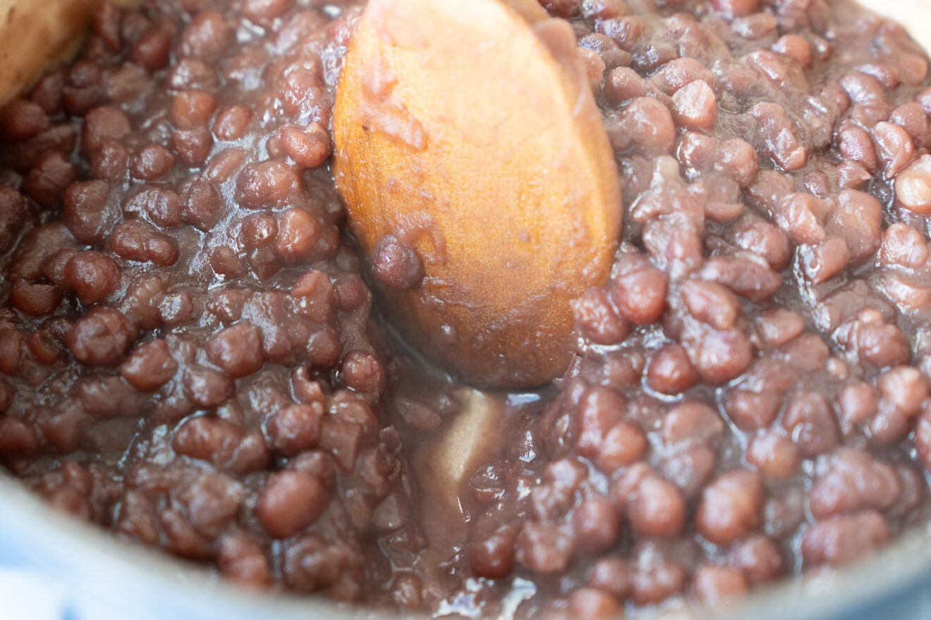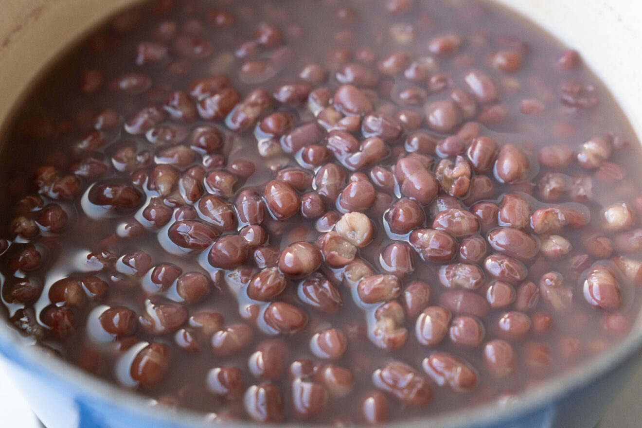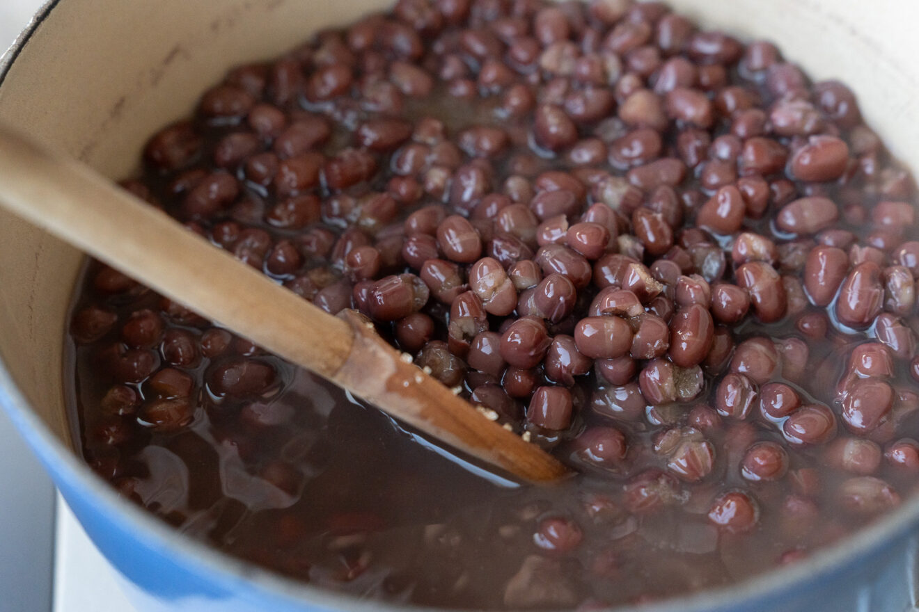 蒸らしながら炊いた小豆は、ふっくらやわらかに。