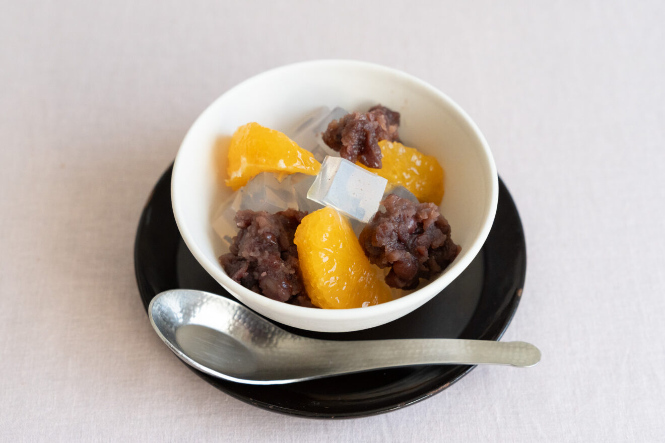 3)器に寒天、柑橘、あんこを盛り付け、仕上げにジンジャーシロップをかけます。