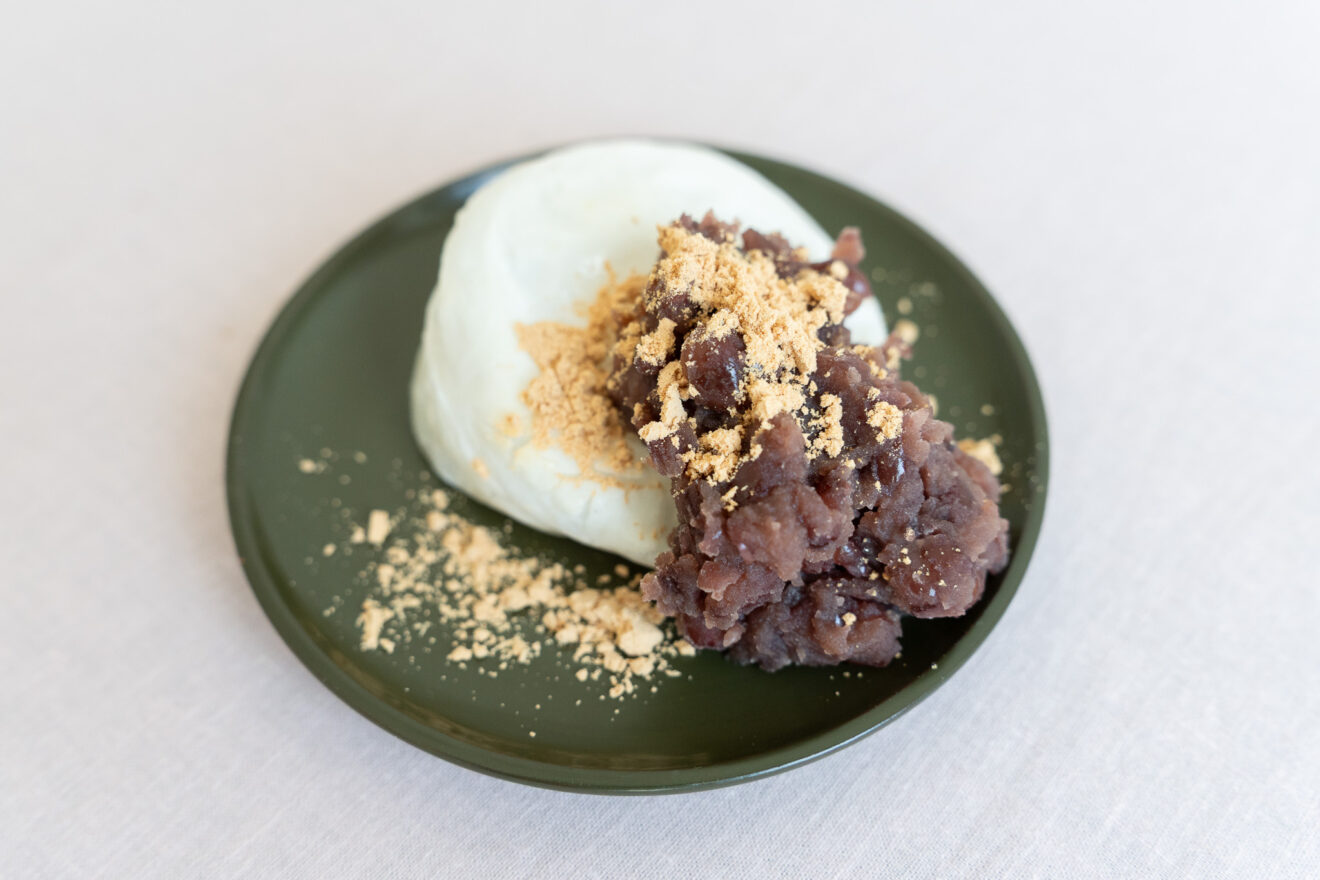 茹でたもち、もしくは焼いたもちに、あんこを添えます。お好みできな粉をかけても。