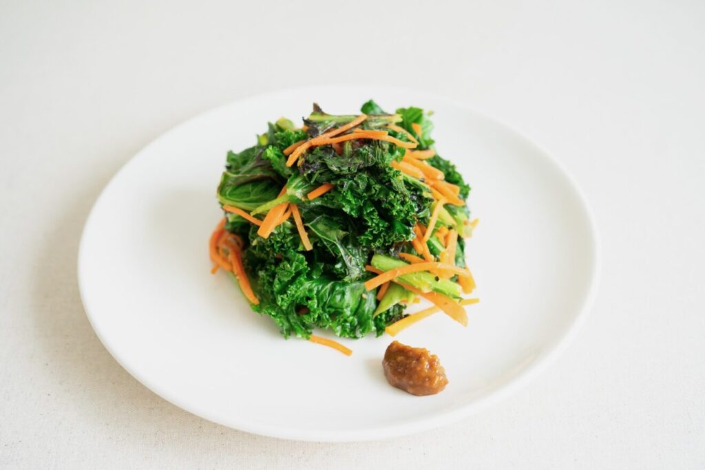 ケールのほろ苦さに、こってりしたにんにく味噌が合わさって、ごはんの進む一品に。