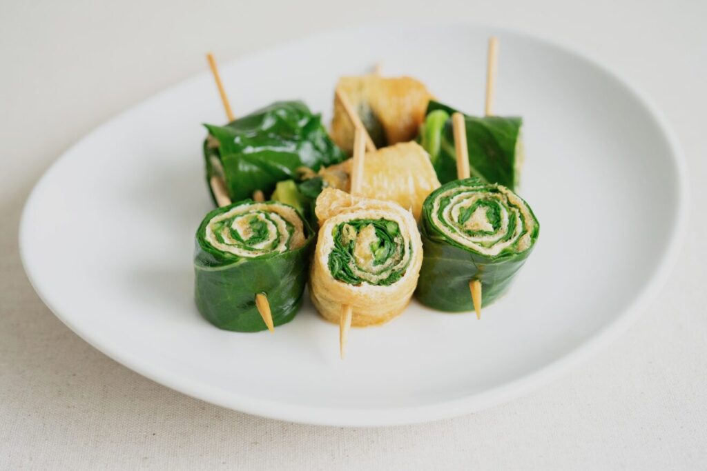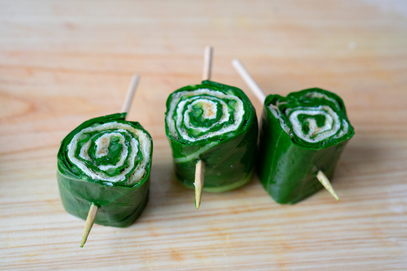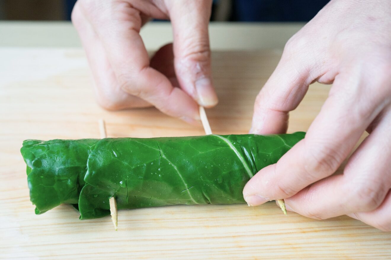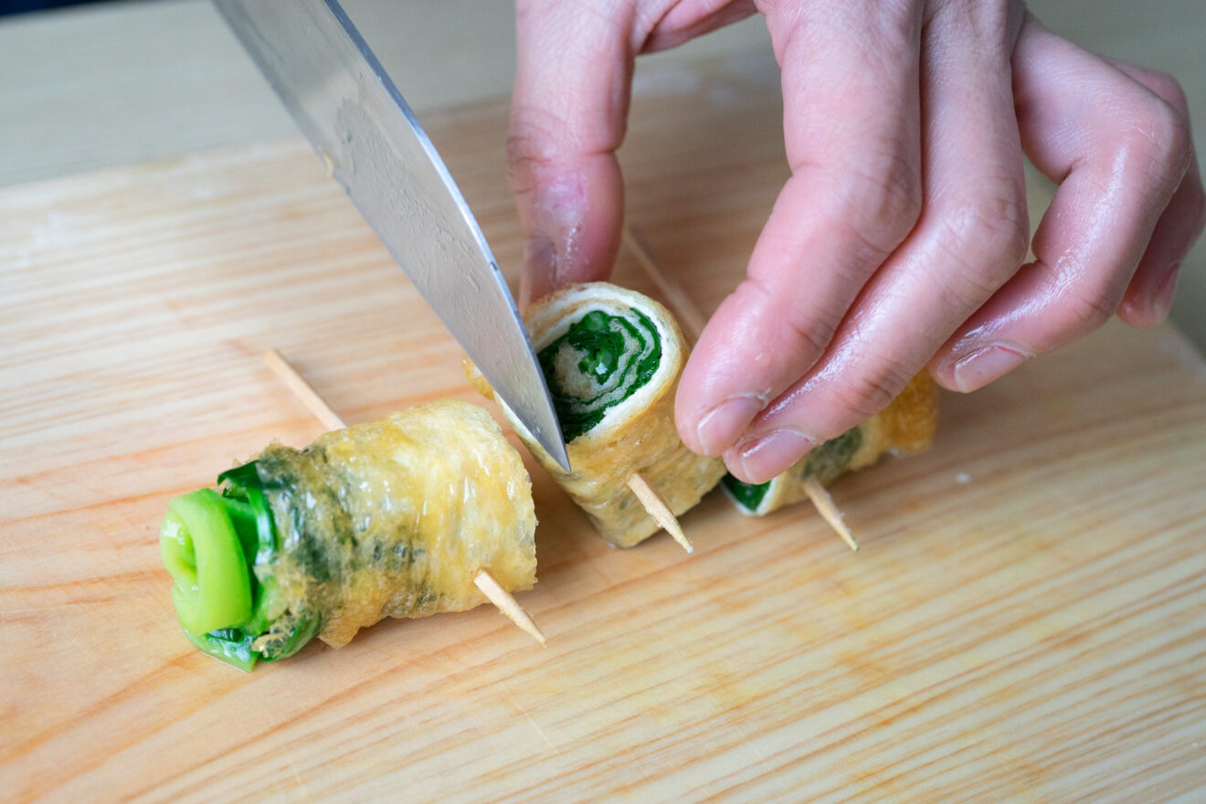 巻き終わりを爪楊枝や竹串などで止め、好みの長さに切ります。