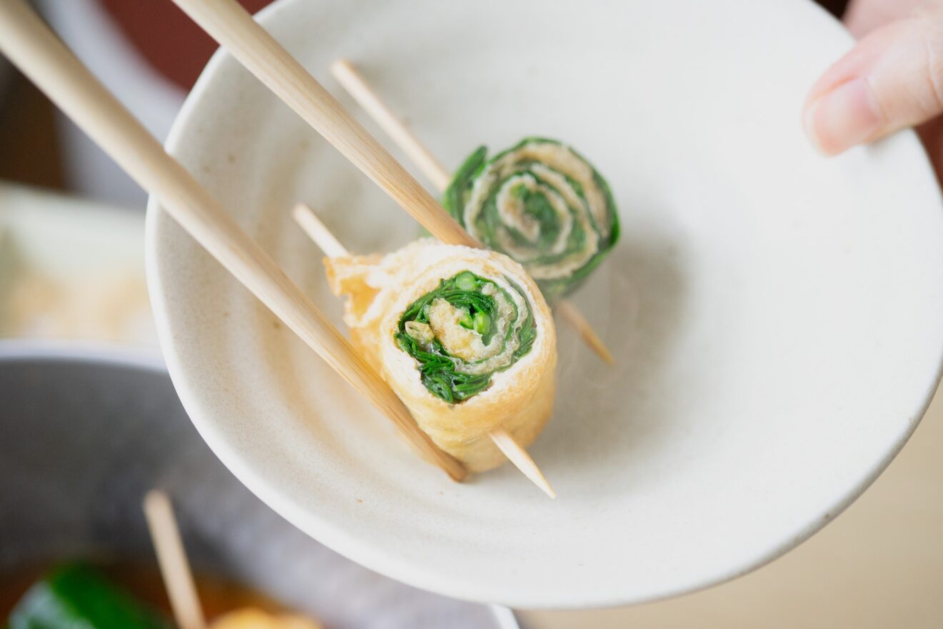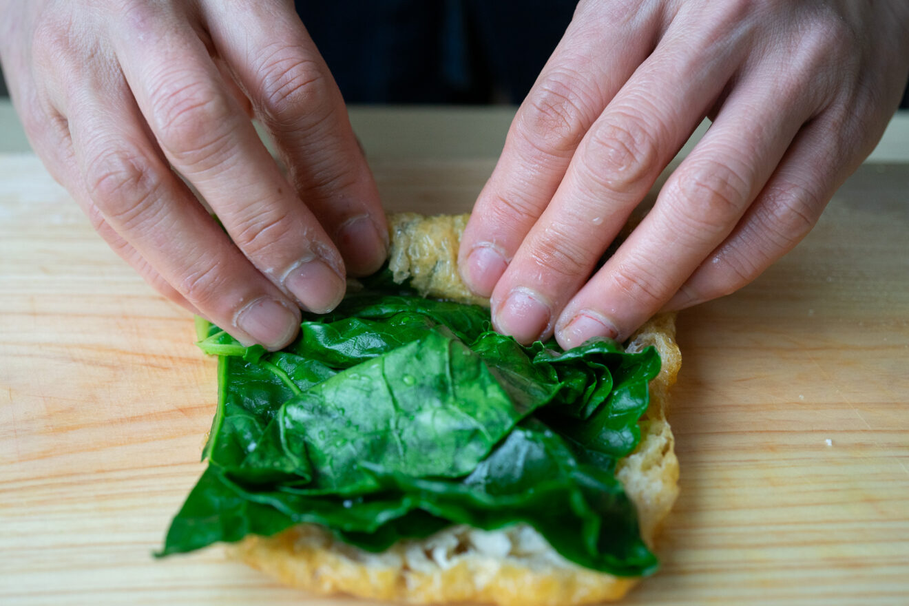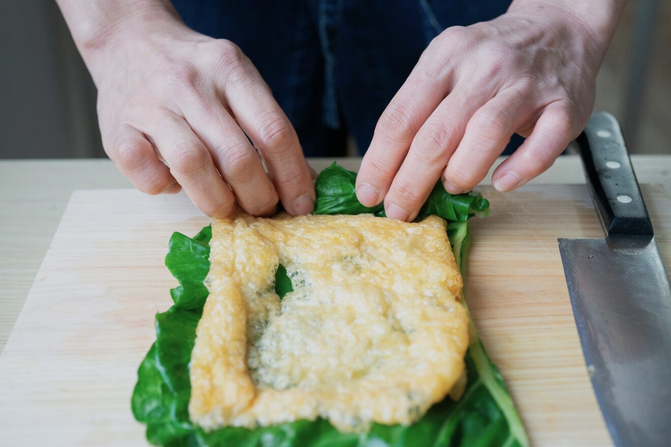 油揚げを下にする時は、ケールが油揚げからはみ出ないようにするときれいです。