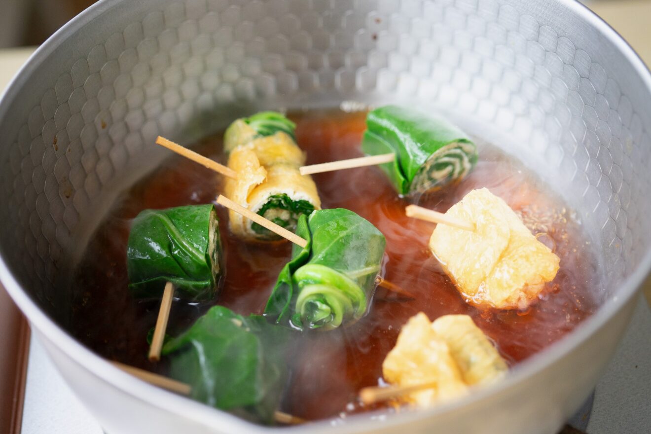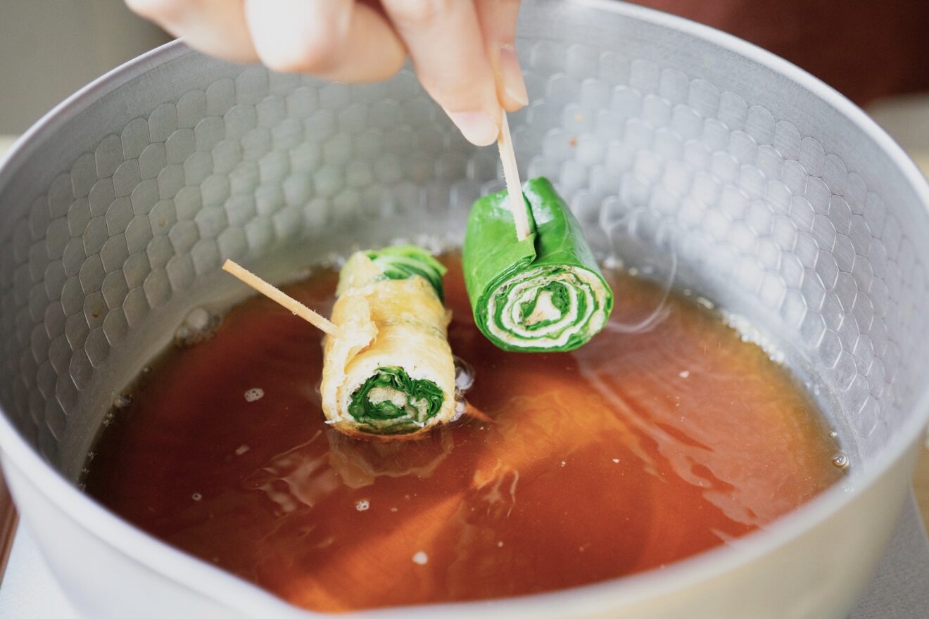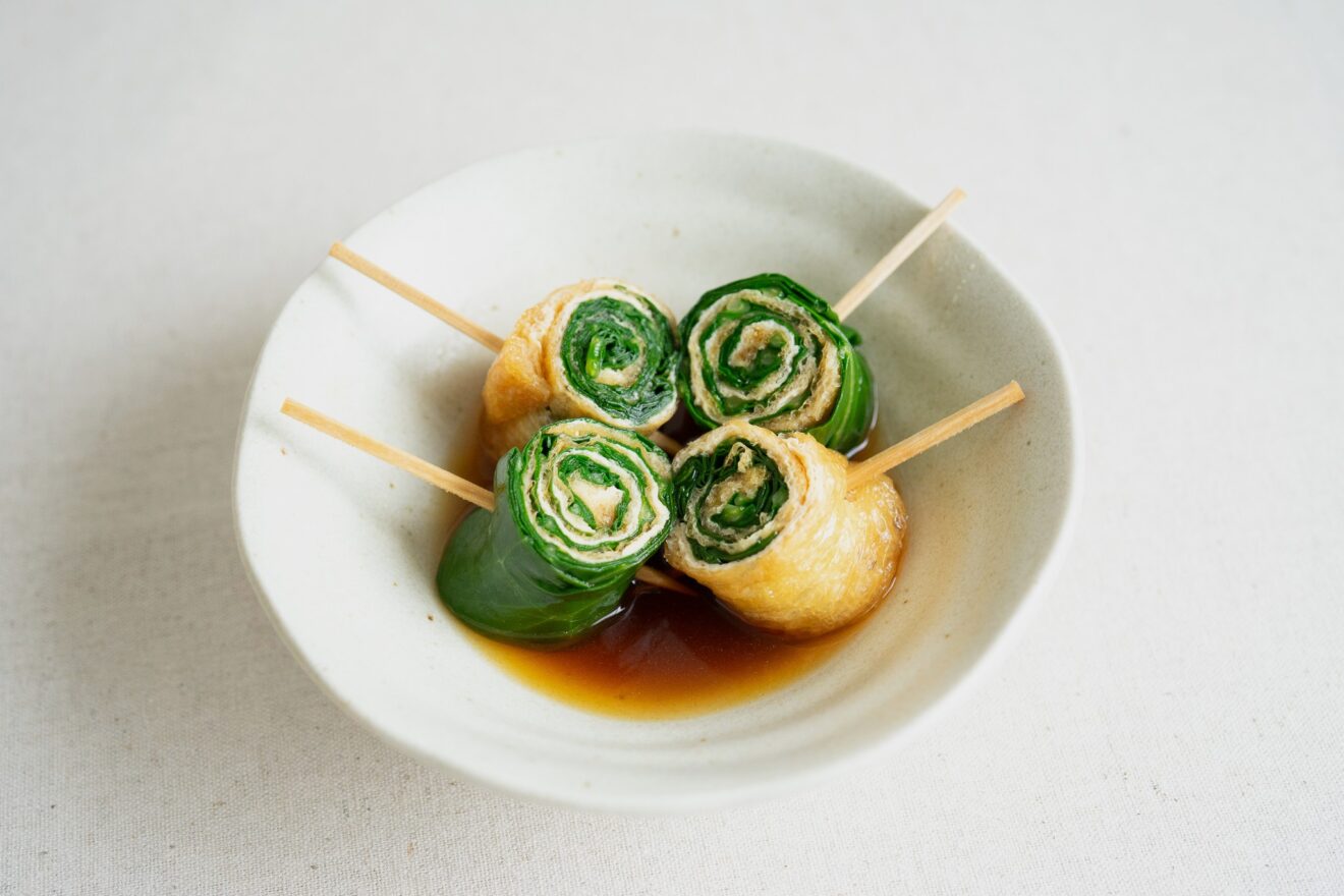 油揚げを下にする時は、ケールが油揚げからはみ出ないようにするときれいです。