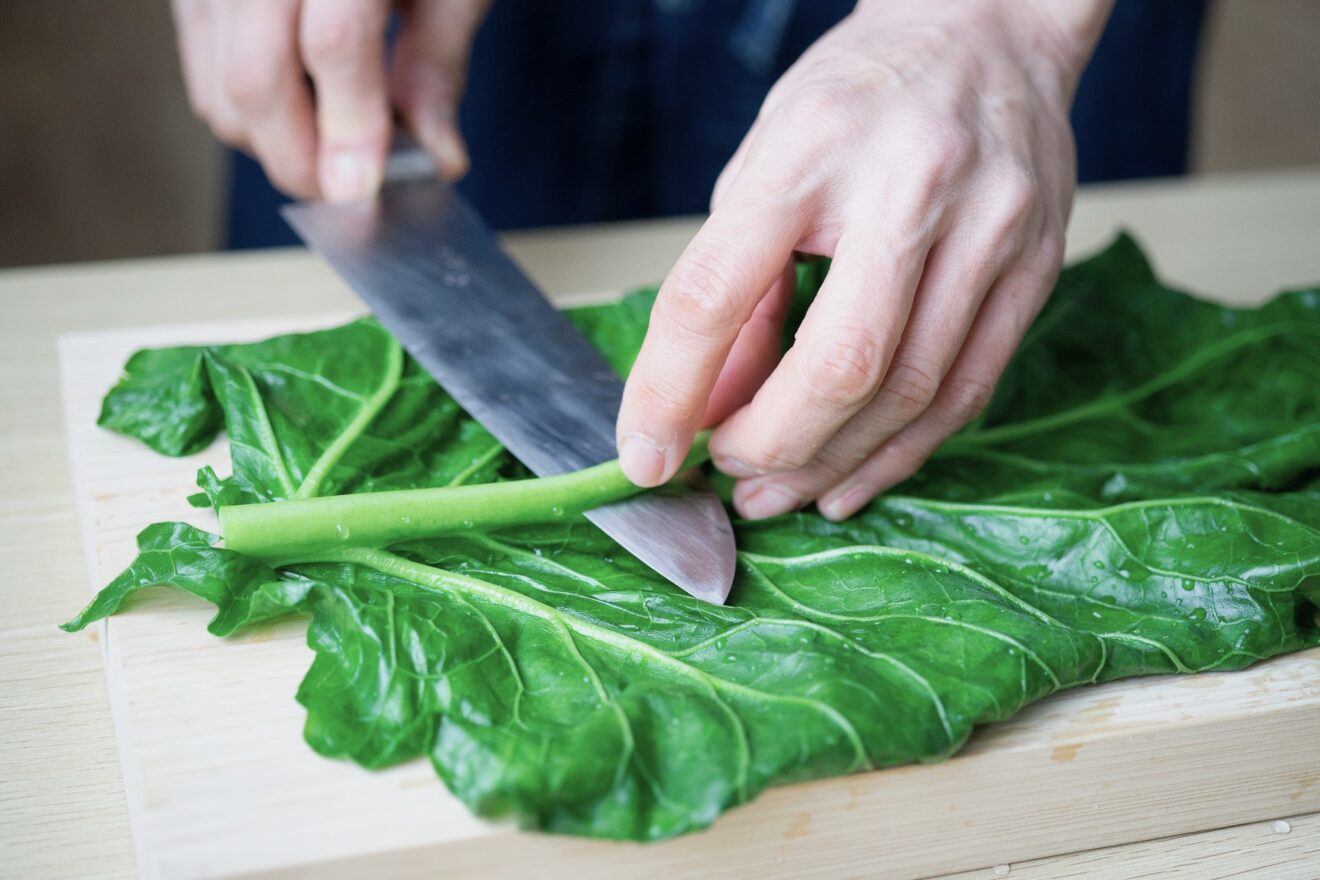 油揚げの長い辺の長さに合わせて切ります(今回はケールが大きかったので、さらに縦半分に切り、2枚重ねて使いました)。