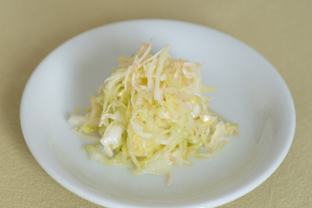 春キャベツのふんわりとした食感に、桜エビの旨みとごま油の香ばしさがよく合います。冷めてもおいしくいただけますよ。