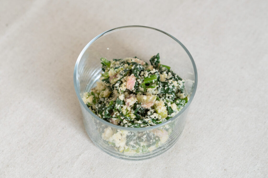 3)Aを混ぜ合わせます。おからの粗熱がとれたらほうれん草とAを加えて混ぜます。