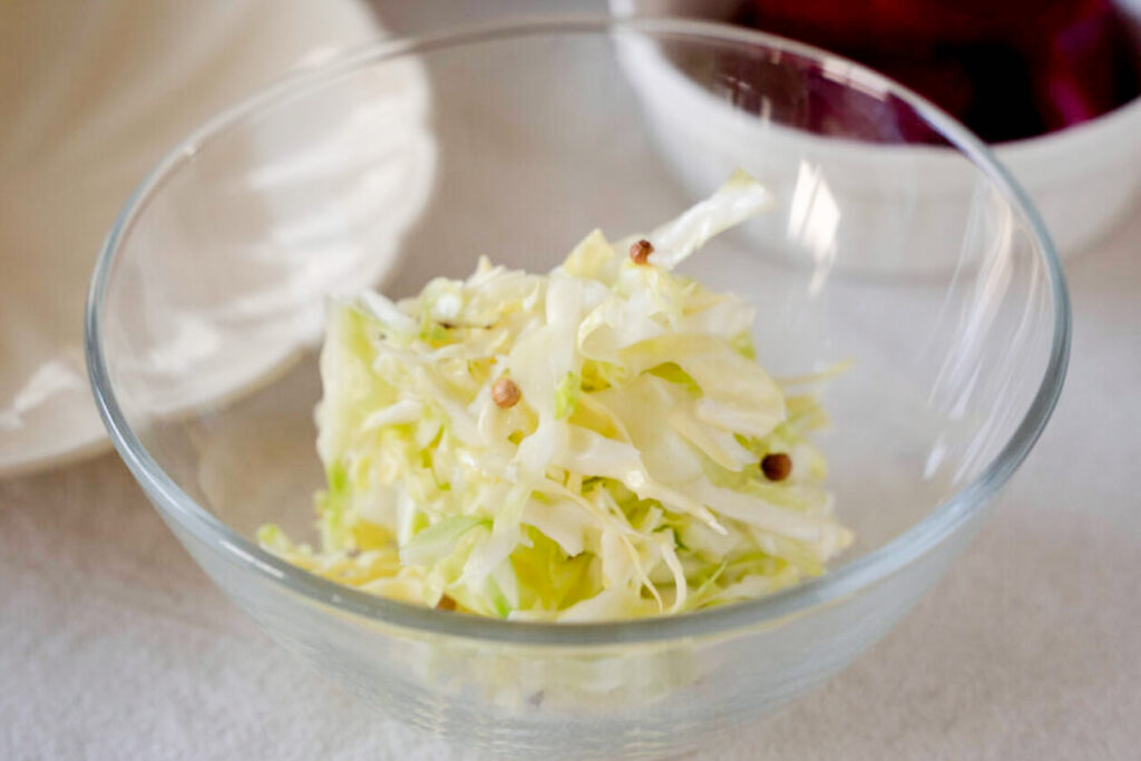 お酢の酸味を活かして、お手軽にザワークラウト風のキャベツマリネをつくります。つよい酸味の苦手な方にも食べやすい、マイルドな味わいです。