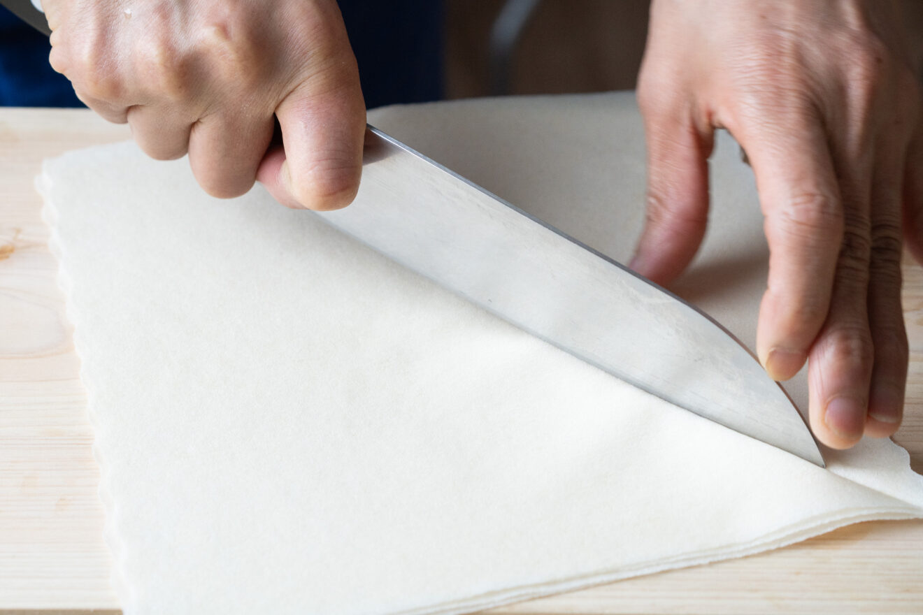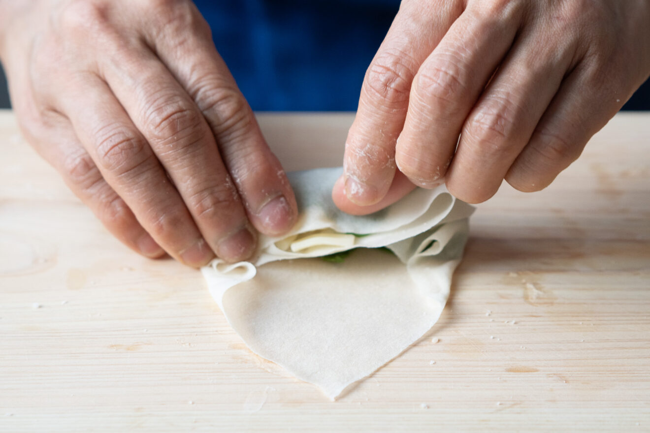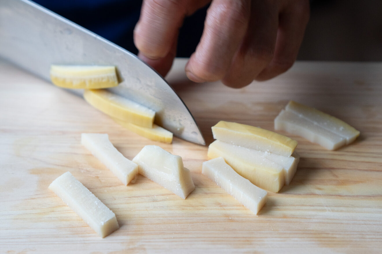 1)たけのこは繊維に沿って、約5mm幅の拍子切りにします。ルッコラは食べやすい大きさに切ります。春巻きの皮は対角線上に半分に切り、三角形にします。