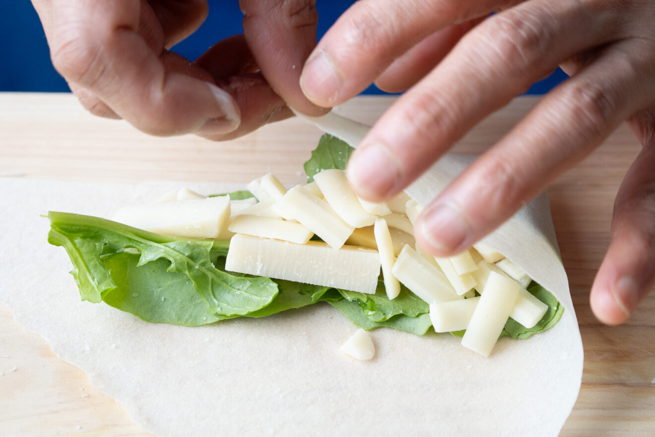 2)春巻きの皮にルッコラ、たけのこ、チーズをのせて、塩を少々振ります。具材を包むように、端からくるりと巻いていきます。