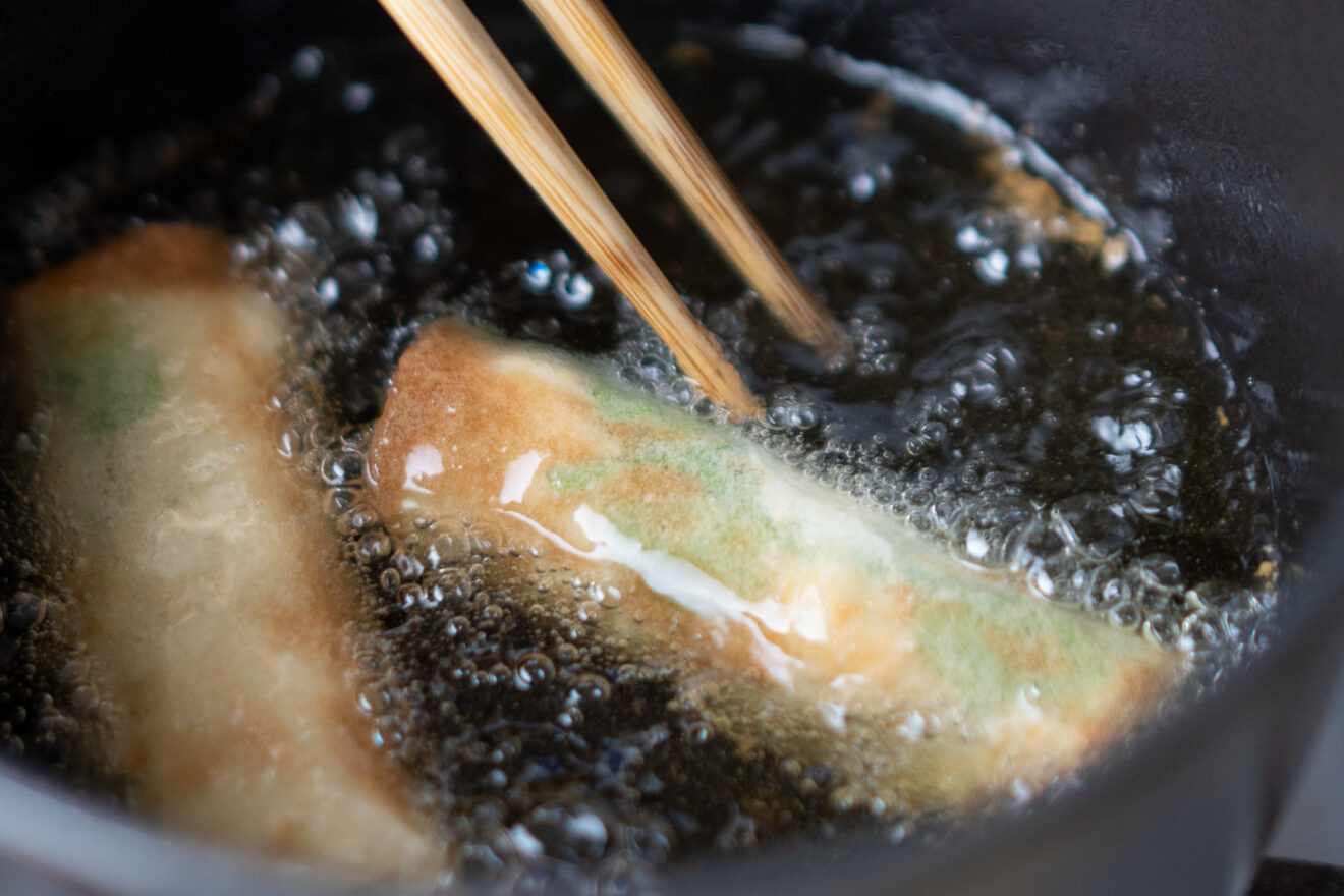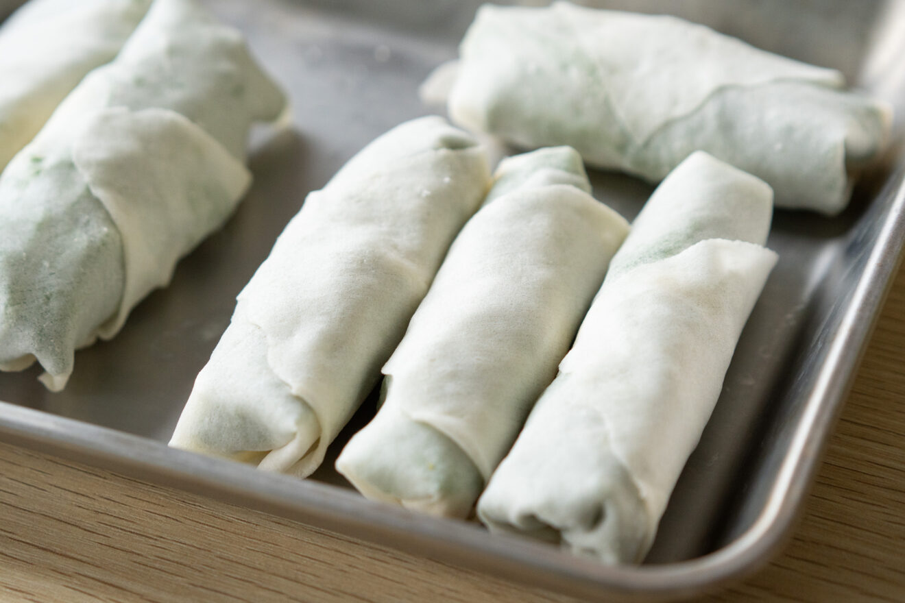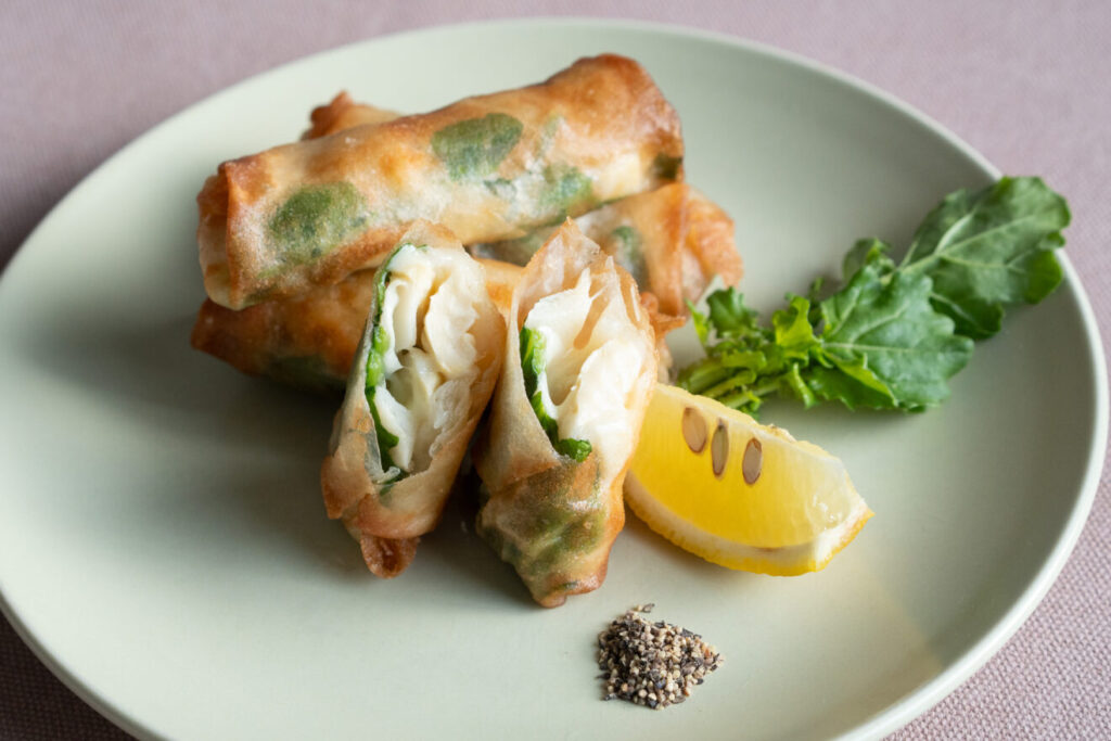 春の味覚、たけのこを春巻きに。春巻きの皮を半分に切って使うことで、たけのこの食感を活かしつつ、軽やかな食べごこちに仕上げます。お弁当やおつまみにもぴったりの一品です。