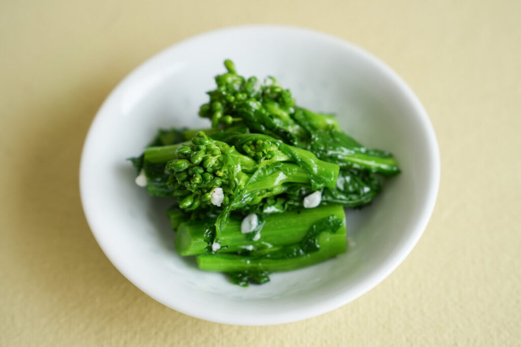 やわらかな菜の花を、塩麹のやさしい甘みで味わいます。いろいろなお野菜でつくって、ご飯にのせればピビンパに。