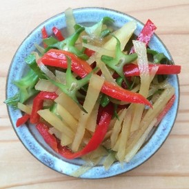 1)じゃがいもは皮を剥いて千切りにし、水にさらします。赤ピーマンは種を取って千切りにします。