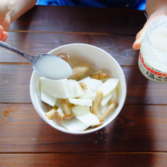3、ハヤトウリとシメジをボールに入れ、塩麹で和える。