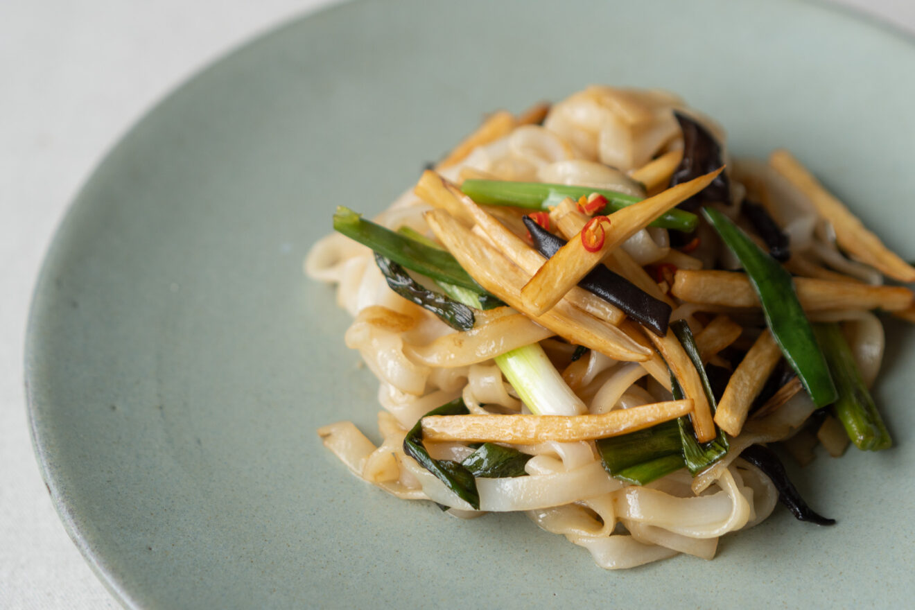 蒸し焼きにした白米麺は、もっちりとした食感に。お酢としょうゆでさっぱりと仕上げます。マコモダケのシャキっとした食感がアクセント。
