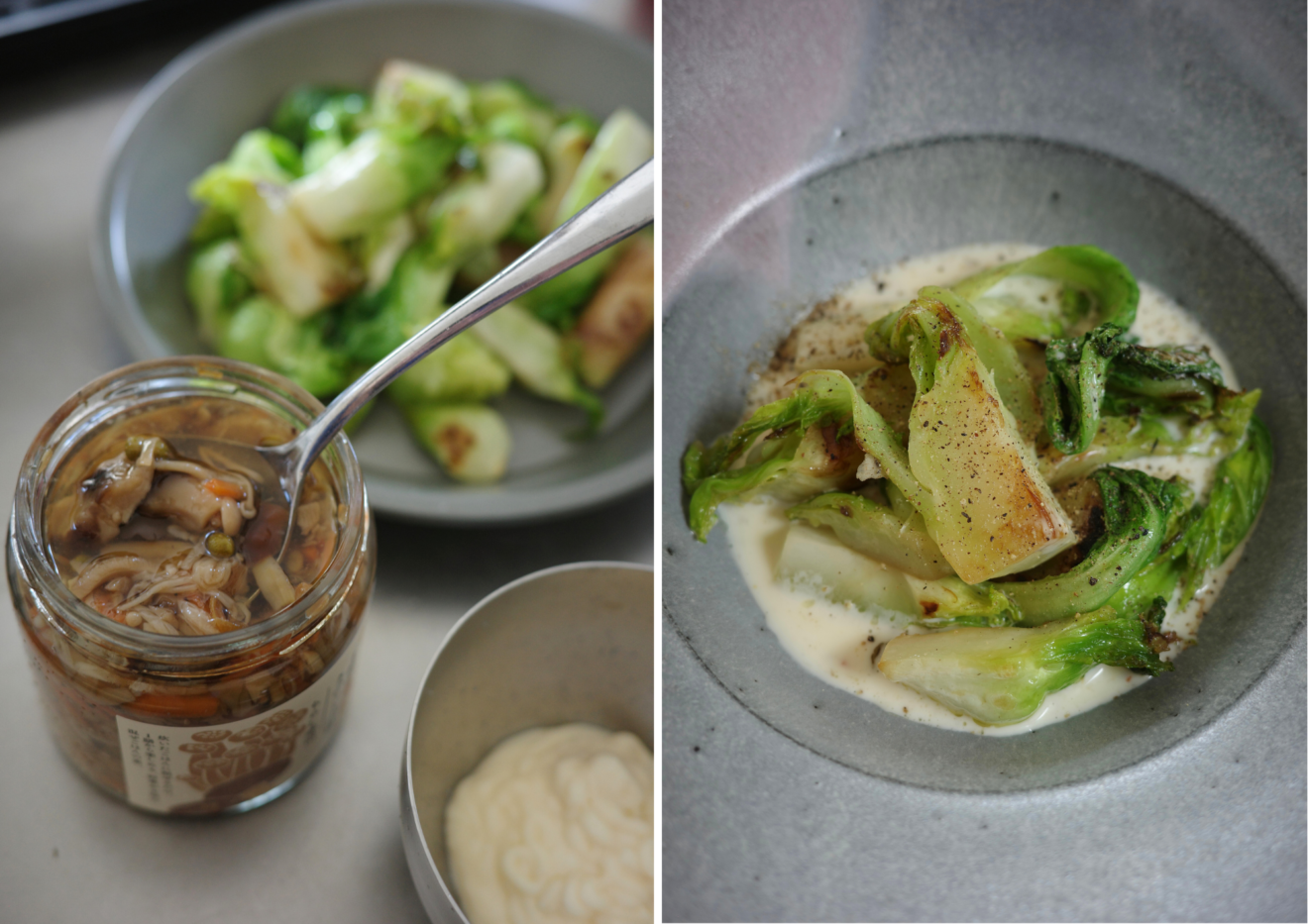 マヨネーズと混ぜてきのこのソースにして、つぼみ菜のグリルにかけました。酸味が効いたマイルドなソースは野菜や魚とも合います。(______tnoieさん) |
