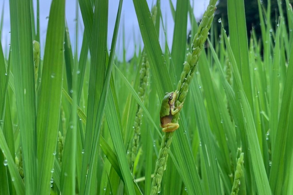 ところが三井さんは、そこに在るものに目を向けました。土手にはさまざまな草が生え、虫たちがあつまり、多様な生態系がつくられていることに気付いたのです。周辺には絶滅危惧種のナミゲンゴロウも。ここに棲むたくさんの生きものは、お米が自然豊かな環境で育っていることを証明してくれている。そう考えた三井さんは、この価値をひろく伝えていくために、水田環境を数値で評価できる鑑定士の資格も取得。20年近く、環境への負担の小さい農業をつづけてきたことで、生きものの数や種類はさらに増えてきているといいます。