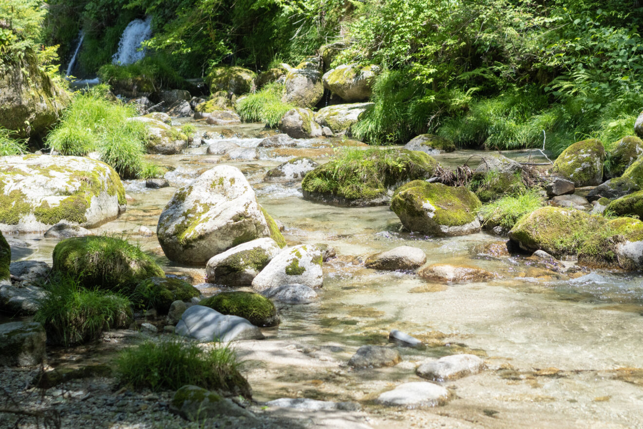 スタッフが訪ねた春の日。田んぼに注ぎ込む水の湧くところを見に行こうと、伊吹山の川の上流まで、筧さんが連れて行ってくれました。