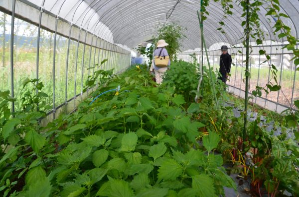 ハウスの中で大事に育てられるハーブ、青しそ、オカワカメ、スイスチャードなど。昔負った怪我で、重いものが持てない片岡さんにとって、ハーブ栽培はとても合っているそう。今は「食べられる野草」という本にハマっていて、「私は一体、どこに向かってるんやろう」と、片岡さん(笑)