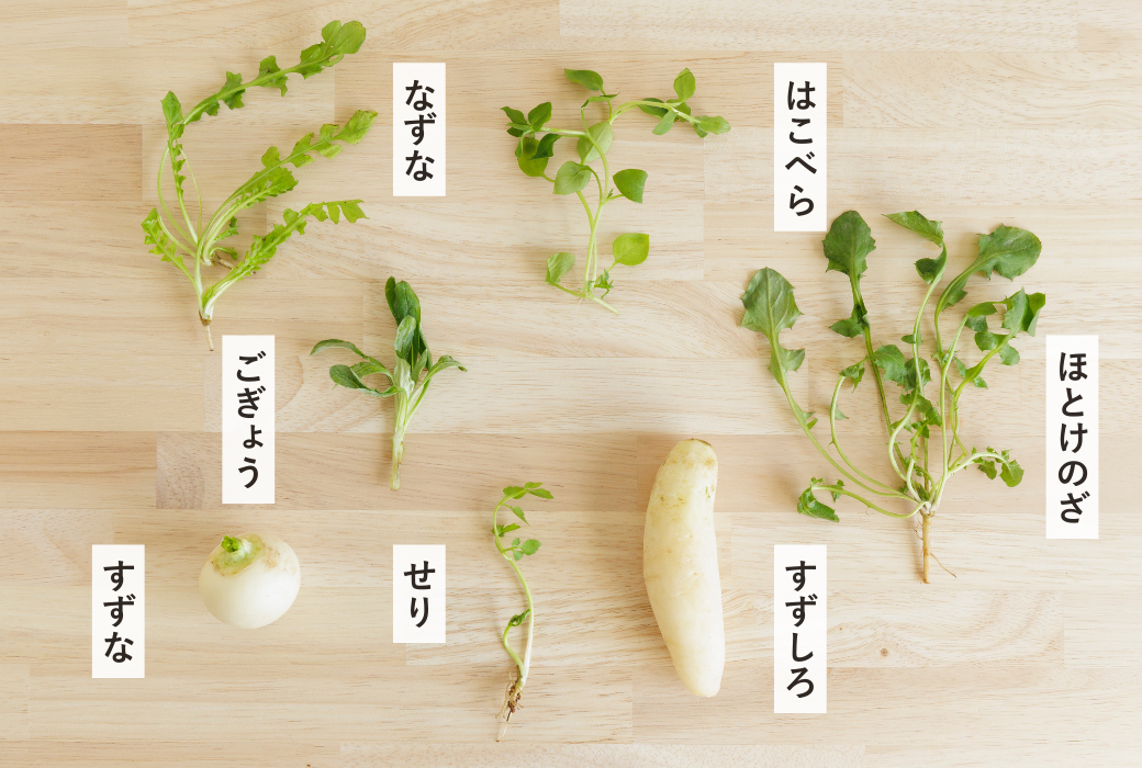 春の七草とは、せり・なずな・ごぎょう・はこべら・ほとけのざ・すずな・すずしろのこと。
