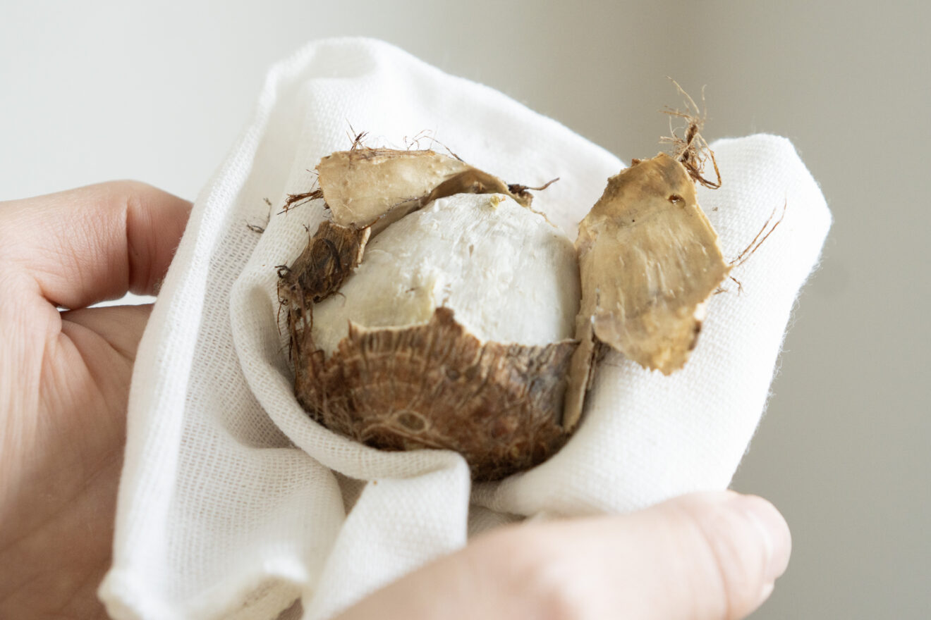 5)布巾などで里芋を包むようにして持ち、皮を剥きます。