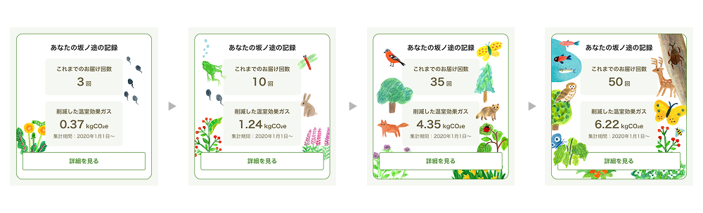 すでにたくさんお届けしている方にもデザインの変化をお楽しみいただきたく、リリース直後は、回数が少ない時期に表示される1段階目のデザインになっています。その後、お客さまのお届け回数に準じて、2週間ごとにデザインが変化していきます。どんな変化があるのか、お楽しみに。
