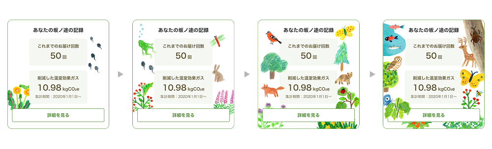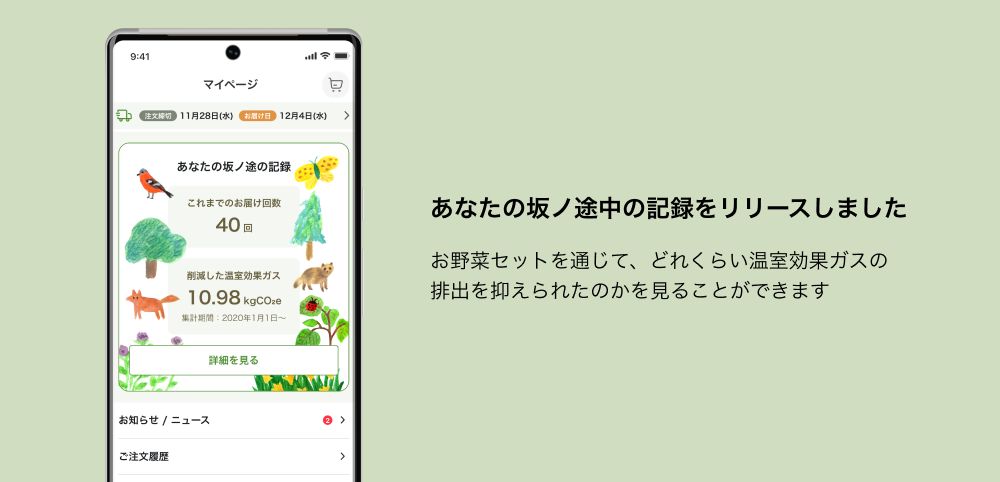 このたび、マイページ内の「あなたの坂ノ途中の記録」から、「これまでのお届け回数」が確認できるようになりました。また、「旬のお野菜セット」または「きほんのお野菜セット」をお届けしたことがあるお客さまは、「削減した温室効果ガス」もご覧いただけます。
