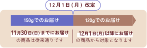 150gの定期宅配をご利用中の方へは、12月1日(月)より、自動的に120gに変更してお届けいたします。