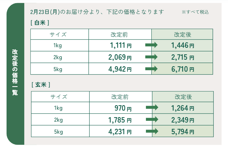 この数年の間で、お米を育て、お届けするまでに必要な資材や輸送費などが大幅に値上がりしております。また、昨今の米価の上昇も踏まえ、坂ノ途中が取り扱うお米も、価格の見直しをさせていただくことといたしました。