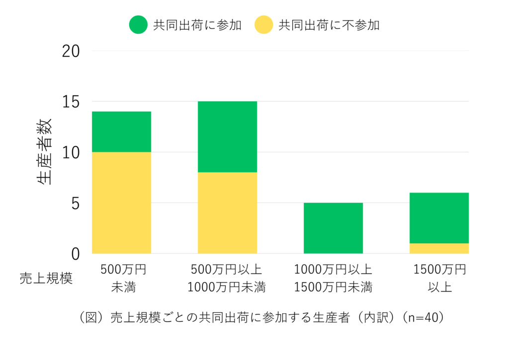 売上と所得の相関関係を分析した結果、総売上1,000万円前後では利益率が高く、農業関連事業や農外事業を組み合わせている傾向があることが分かりました。また、売上1,000万円以上の規模になると共同出荷への参加が大勢を占めています。こうした、売上による農業の形の違いは、今後もデータを蓄積していくことで、就農の検討材料や就農後の経営判断の指標となりえます。