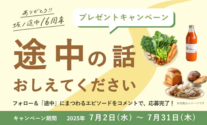 坂ノ途中公式Instagramでは、みなさまへの感謝の気持ちを込めて、プレゼントキャンペーンを実施中です! 「途中」にまつわるエピソードを送ってくれた方へ、抽選で様々なプレゼントをご用意しています。 *キャンペーンの受付は終了しました