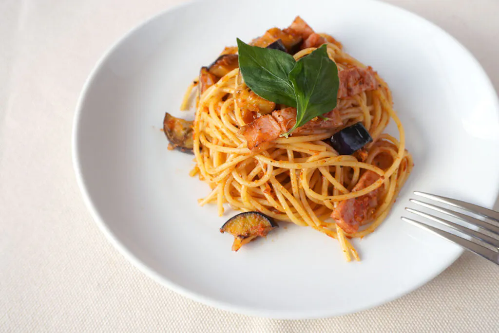 ■なすとベーコンのトマトソースパスタ