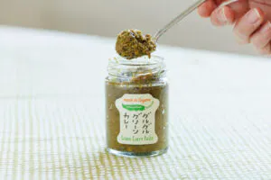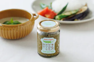 このグリーンカレーペーストは、数種類の青唐辛子をブレンドして作られています。その他の材料も、自家農園もしくは国産の香味野菜、山口県産の塩、ハーブやスパイスもオーガニックのもので、素材はひとつひとつ納得できるものを選んでいます。小麦粉不使用でグルテンフリー。植物性素材のみでつくられているので、ベジタリアンの方にもおすすめです。