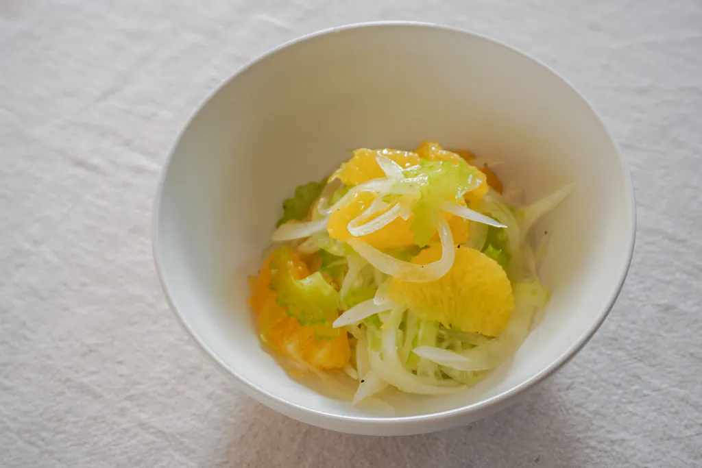 スライスした軽い食感の新玉ねぎとセロリに、みずみずしい甘夏を合わせました。お塩とオイルだけのシンプルな味付けで、甘夏の明るい酸味が引き立ちます。