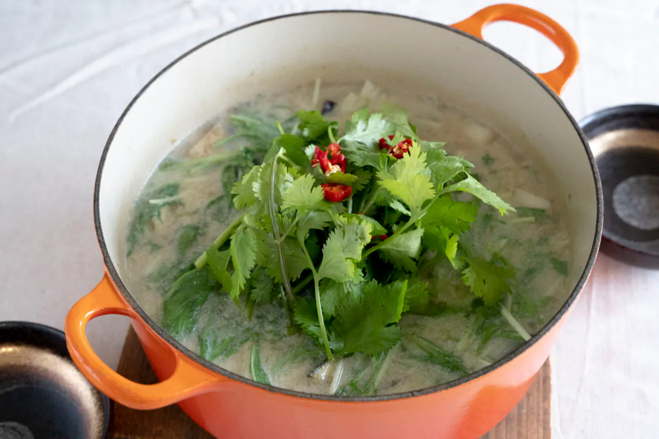 用意するのは、ココナッツミルクもしくは豆乳と、お好みの野菜や海鮮、肉類などの食材だけ。夏は、オクラやナスなどの夏野菜を入れて楽しむのがおすすめです。