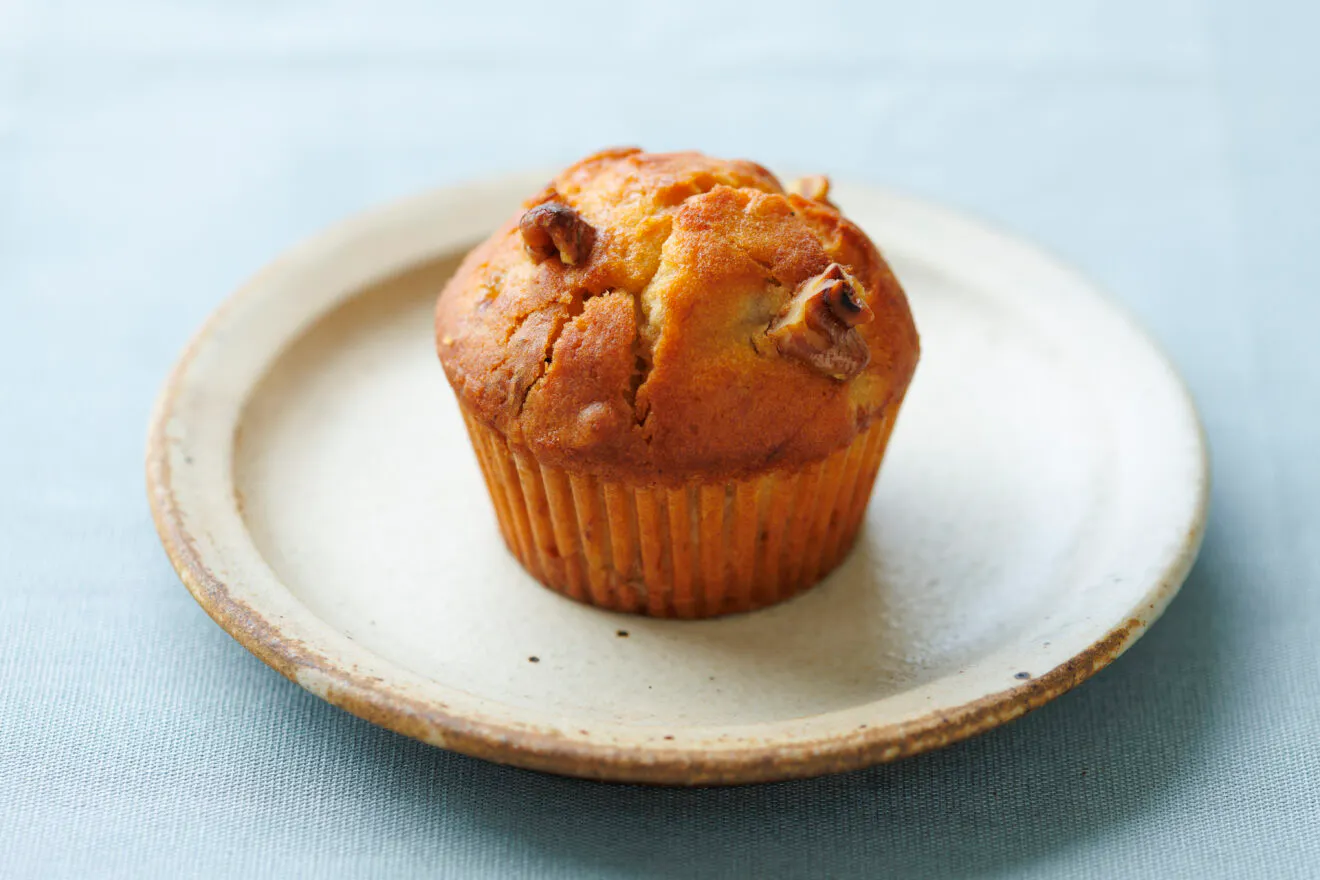 米粉をつかった、しっとりした生地のマフィン。バナナのやさしい甘みに、くるみの香ばしさがアクセントになっています。