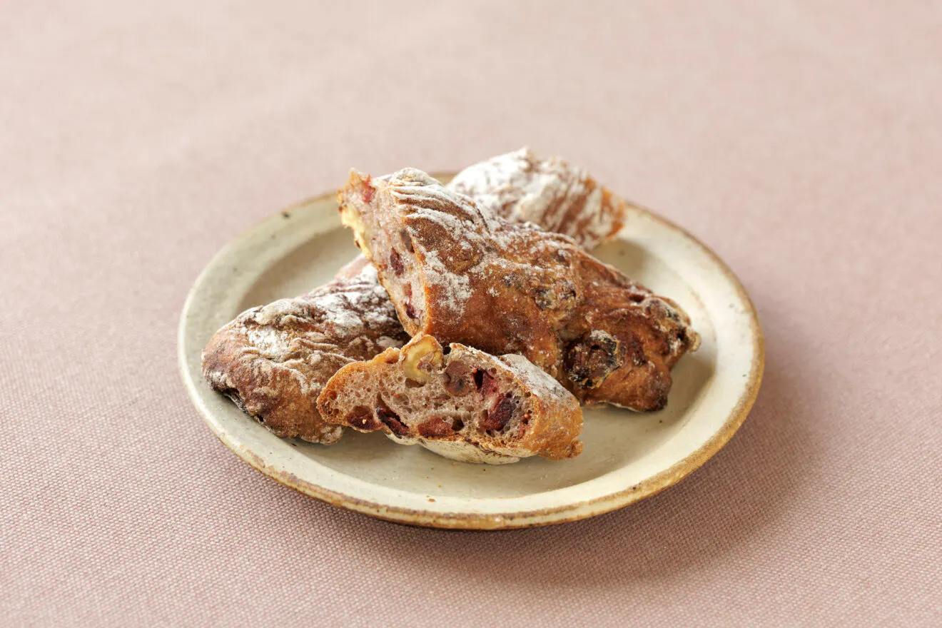 たっぷり練り込んだクランベリーの酸味と、くるみの香ばしさが相性抜群のハードパン。ぎっちりと詰まった生地に、どこを切ってもクランベリーとくるみが顔を出すくらい贅沢に入っています。