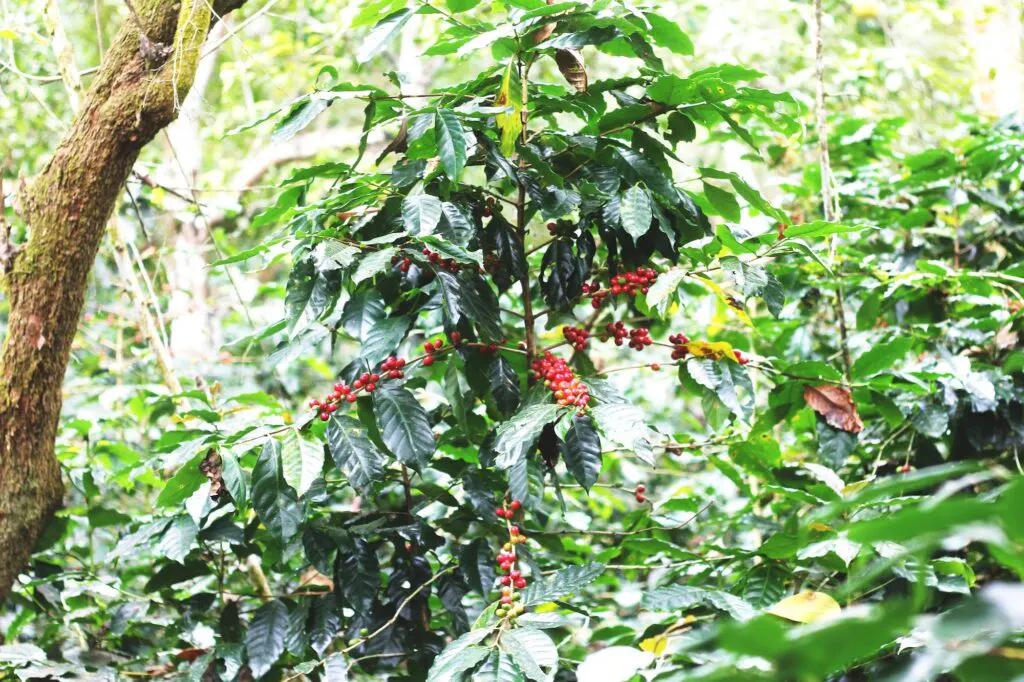 普段目にする茶色いコーヒー豆は、コーヒーノキという植物の果実の種の部分。コーヒーノキはジャスミンのような白い花を咲かせたあと、さくらんぼのような赤い実をつけます。その見た目から、果実は「コーヒーチェリー」と呼ばれます。