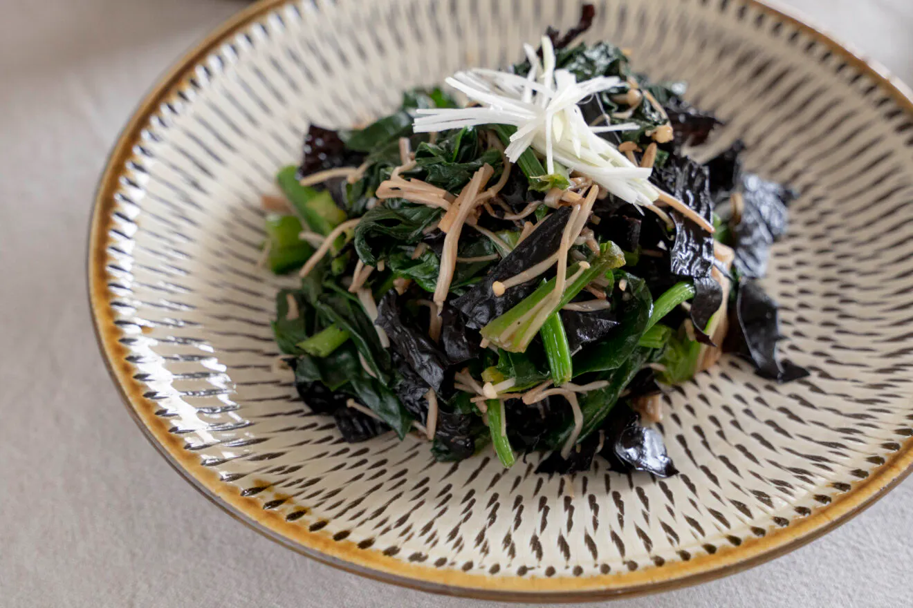 シンプルな炒めものも、食感が違うものをあわせて楽しいひと皿に。しょうがも入って身体もぽかぽかになりますよ。ちぢみほうれん草は、甘みをいかすため最後にさっと炒めるのがポイントです。