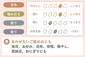 「湖国のたから米」と名付けたこのお米は、やや大粒であっさり。滋味深い甘みとうまみは、毎日でもお箸がすすむ味わいです。昔ながらの品種で、とくに梅干し、海苔、お味噌汁といった日常的な和食によく合います。粘りがひかえめで、味なじみがよいので、ちらし寿司や巻き寿司などにもおすすめ。ハレの日にも、ケの日にも、寄り添ってくれる、そんなお米です。