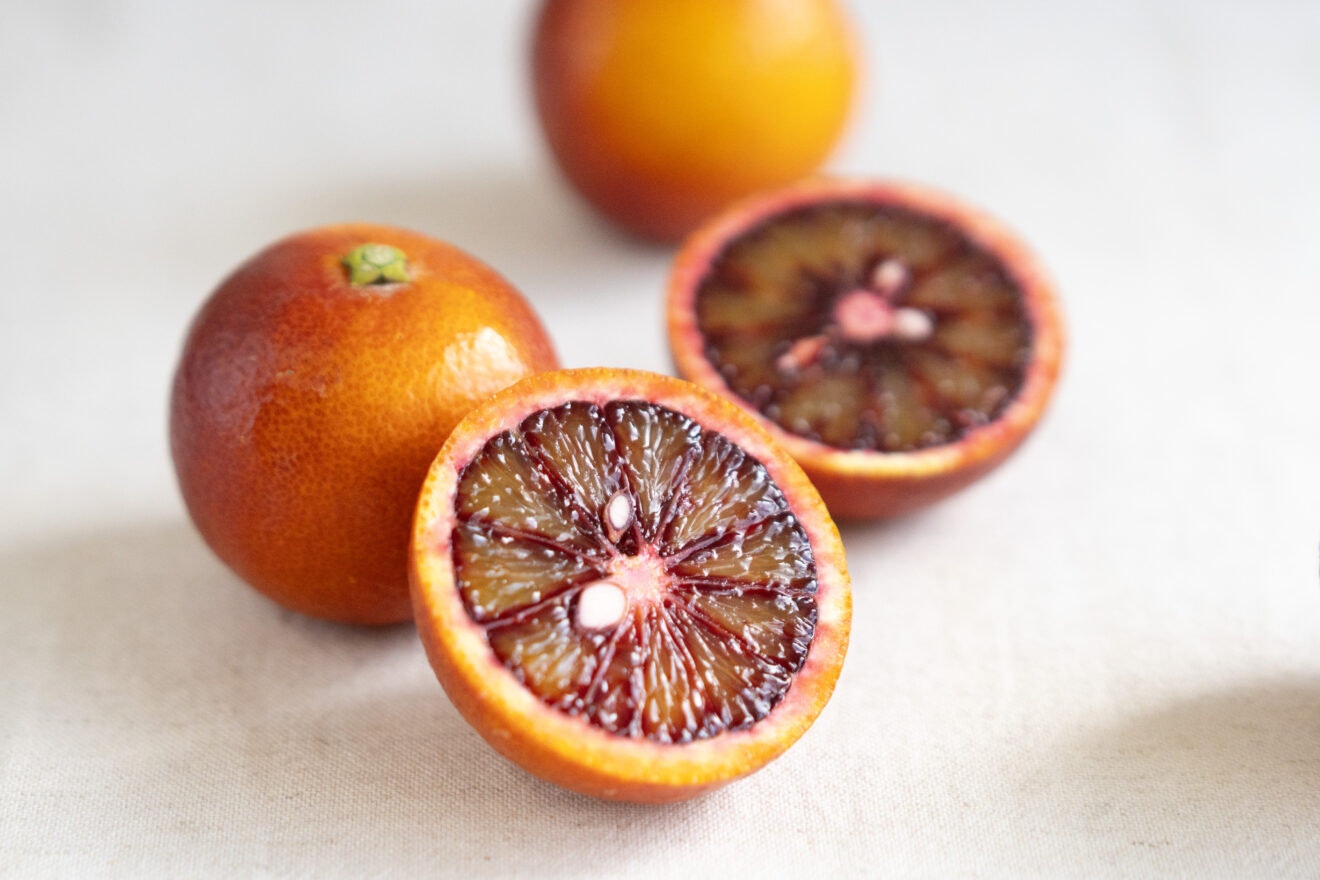 1つ70g前後と小さなブラッドオレンジ「モロ種」をお届けします。仲間の「タロッコ種」に比べて果肉の赤紫色がより濃いのが特徴です。ジュースにすることが多く、鮮やかな色彩とともに、深い甘味と酸味が楽しめます。