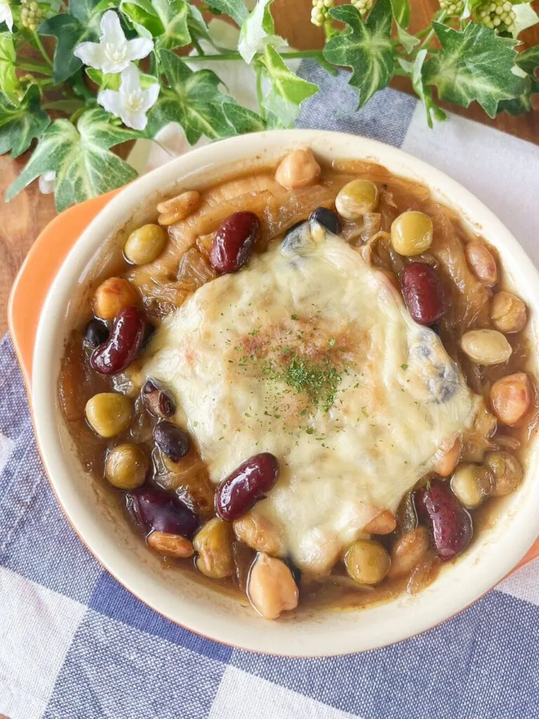 とろっとした玉ねぎと、ふっくらミックスビーンズがおいしいスープです。