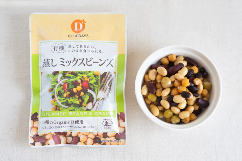 蒸し大豆をはじめ、環境への負荷の小さな豆製品を扱うだいずデイズさん。その中でも、特に人気の蒸しミックスビーンズをお届けします。ひよこ豆、大豆、青えんどう、赤いんげん、黒いんげんの5種類それぞれの、味わいや食感のちがいが楽しめます。