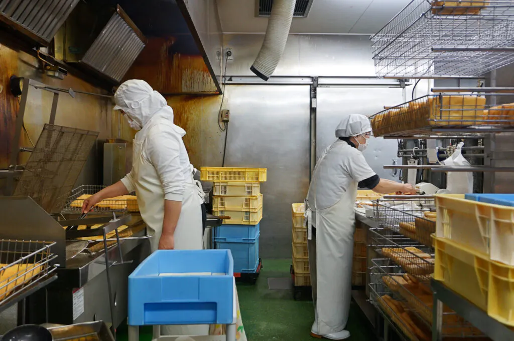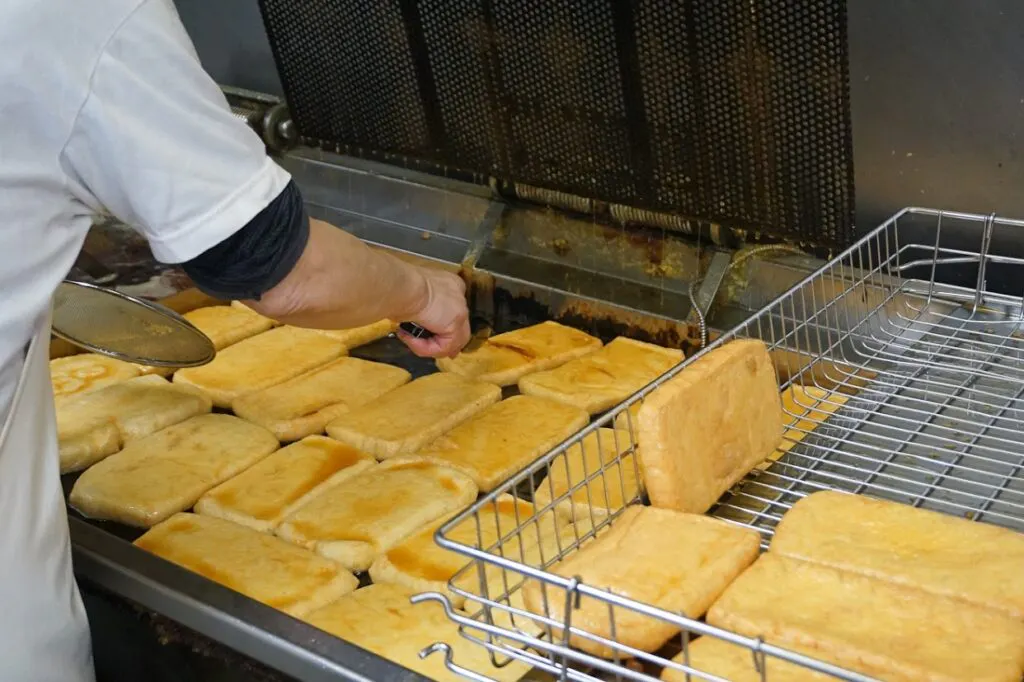 膨張剤は使われておらず、大豆のたんぱく質と職人技の温度調整で膨らませた、ふっくらとした食感が特長。一枚一枚、丁寧に手作業で揚げられています。