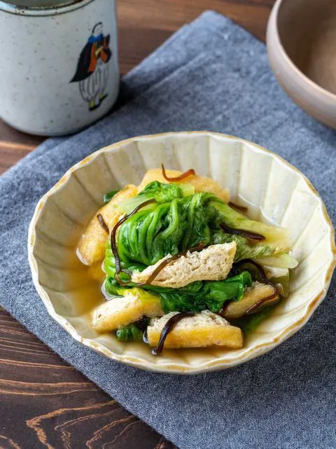 くせのないレタスは、実は和食の味付けにもよく合うんです。油揚げや塩昆布を使えば、短時間でもしっかり旨みが出ます。