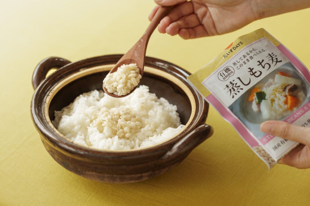蒸されているので、炊きあがったごはんにまぜるだけで、もち麦ごはんがたのしめます。